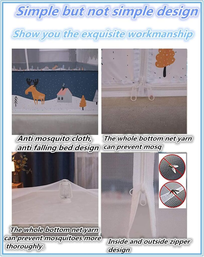 Double Door Zipper Switch: There are three-way zipper on both sides of the mosquito net for easy access. 360 °full protection to prevent orfrom falling off the bed.